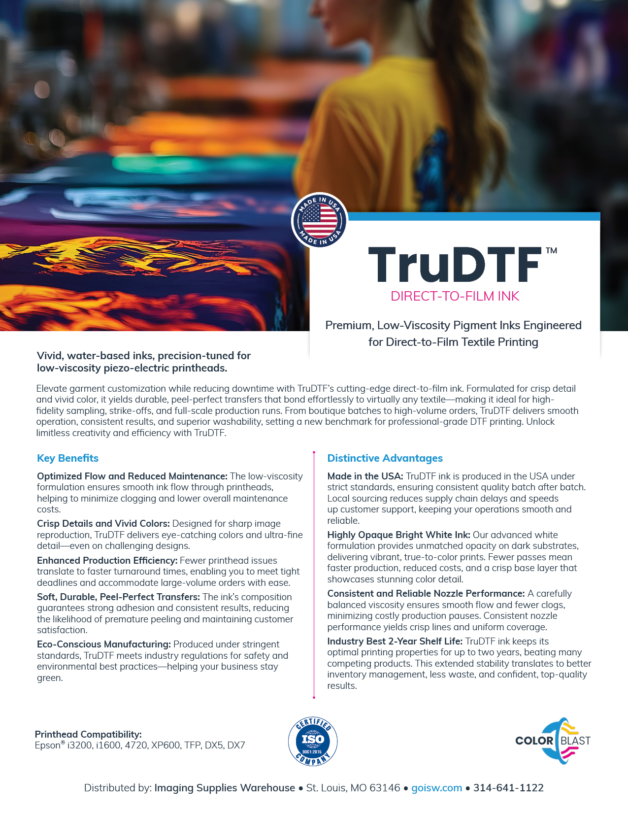 Bring every color to life and protect the engine that makes it happen. ColorBlast TruDTF Ink marries explosive, wide-gamut brilliance with a rock-solid 24-month* printhead guarantee—so you can push production without fearing downtime.