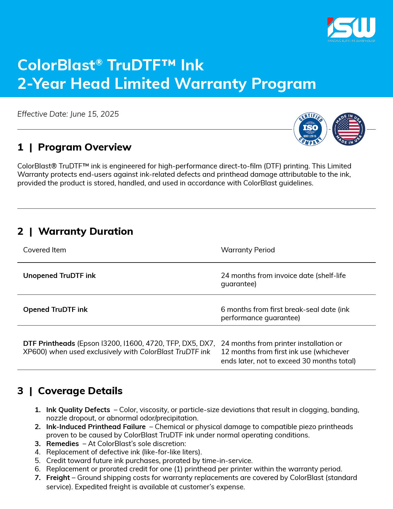 Covers one compatible Epson® head per printer (i3200, i1600, 4720, XP600, TFP, DX5, DX7) for up to 24 months from install—or 12 months from first ink use, whichever ends later (max 30 months). We pay for the replacement head and ground shipping; you pay nothing when a validated claim is approved. -